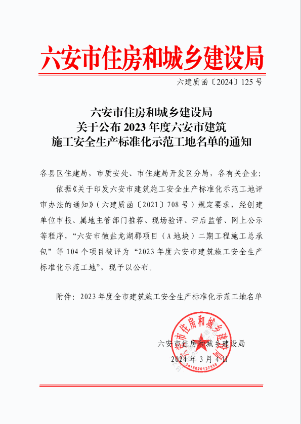 六安市住房和城鄉(xiāng)建設(shè)局關(guān)于公布2023年度六安市建筑施工安全生產(chǎn)標(biāo)準(zhǔn)化示范工地名單的通知